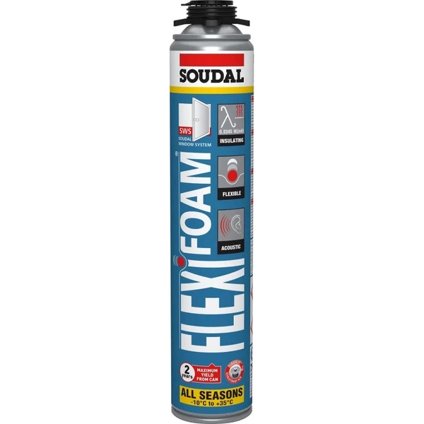 Piana montażowa Soudal FLEXIfoam 750 ml idealnie nadaje się do uszczelniania i montażu stolarki okiennej i drzwiowej, zwłaszcza o dużych gabarytach i narażonych na wibracje. Doskonale sprawdzi się przy izolacji termicznej i akustycznej, wypełnianiu szczelin oraz montażu konstrukcji narażonych na zmiany wymiarów, takich jak profile aluminiowe, ściany działowe czy przegrody budowlane.